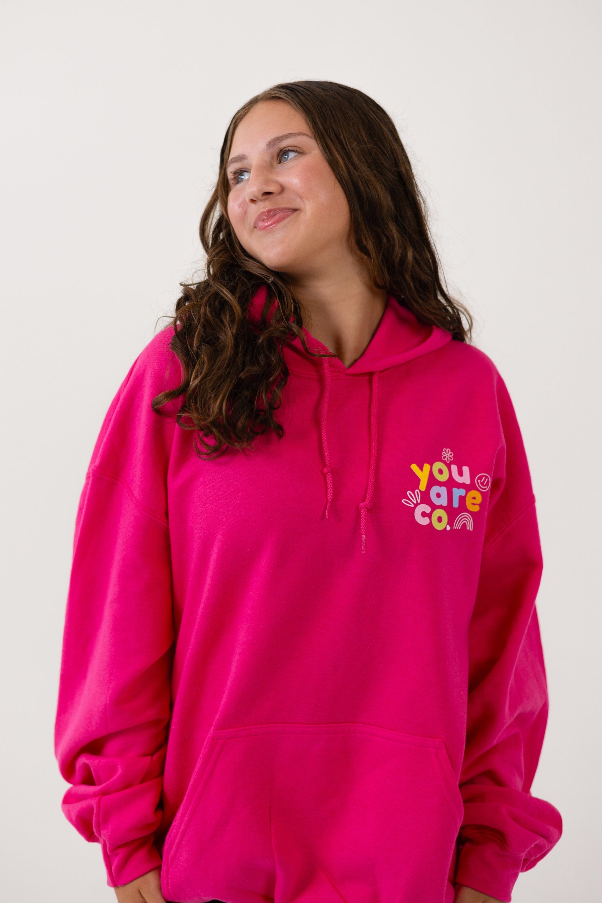 Just when you thought we’d be done with the bright colored hoodies…you’ve been mistaken. Joining the colorful crew, the BE KIND hoodie adds a new saying, design, and doodling to the mix. This hoodie has a small “You Are Co.” design on the front and the “be kind to yourself today” design large on the back. This hoodie is ready to be your new summer go-to from the campfire to the farmers market to movie night.