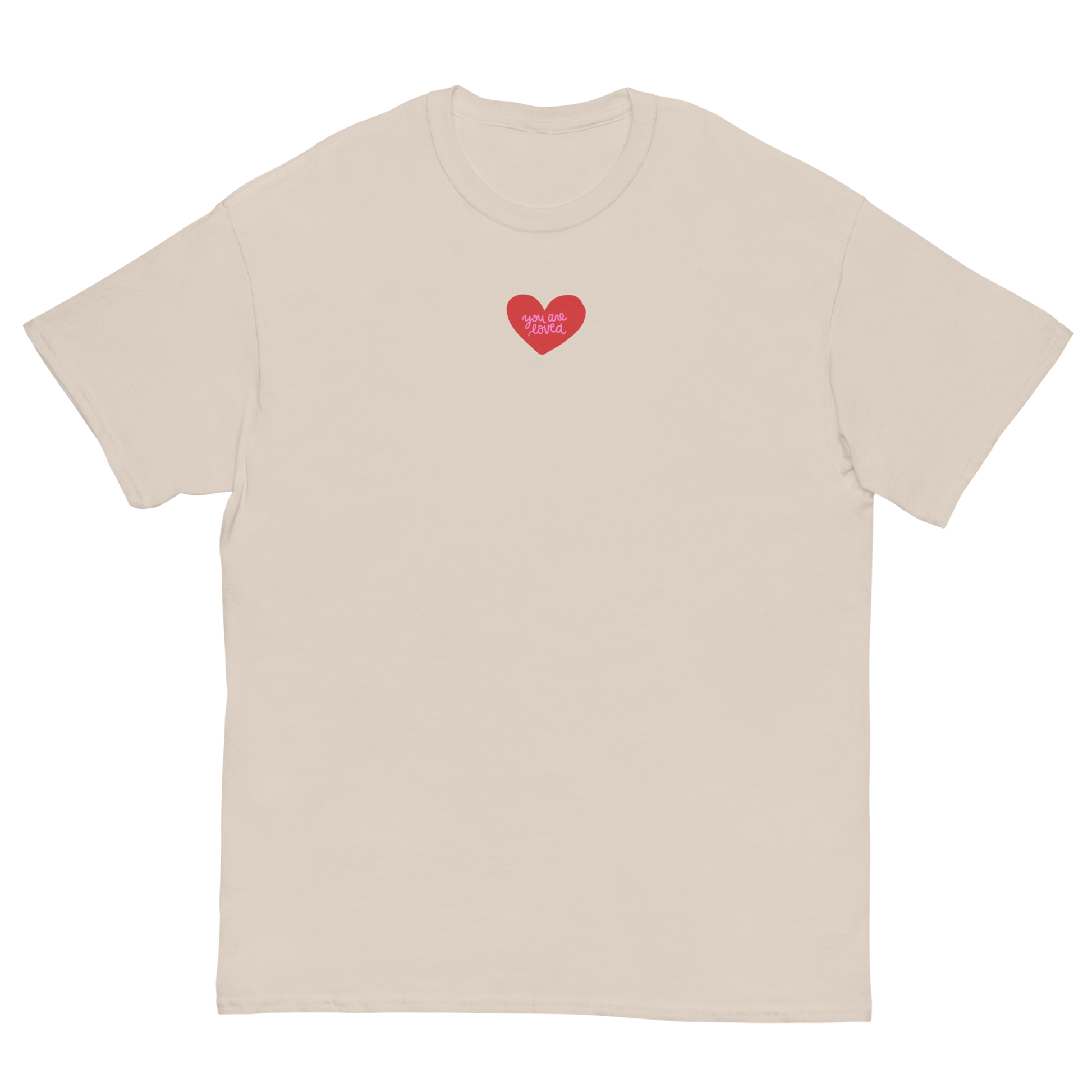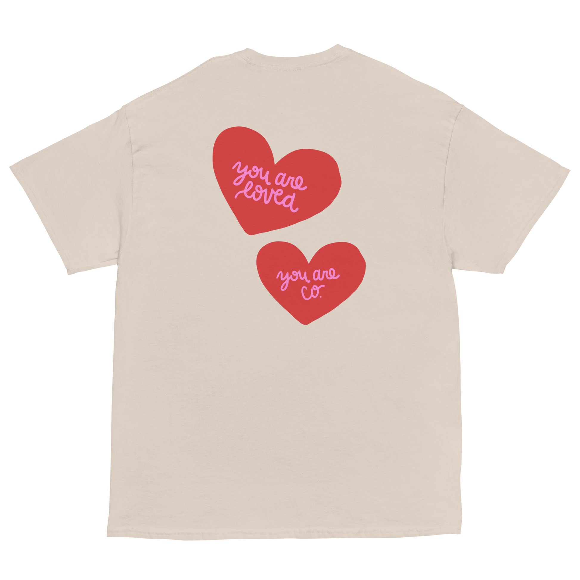 Back: printed two pink/red hearts design "You Are Loved", "You Are Co."