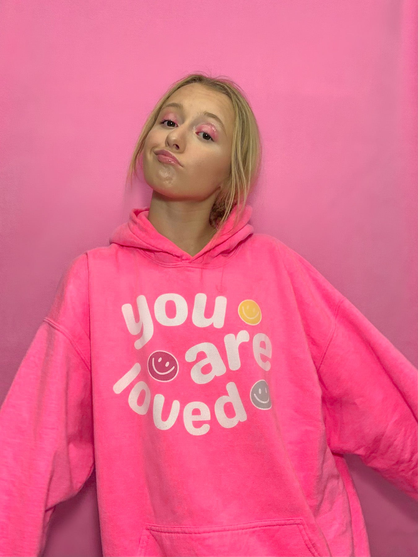 Some hoodies may be a slightly darker pink due to supply chain issues.